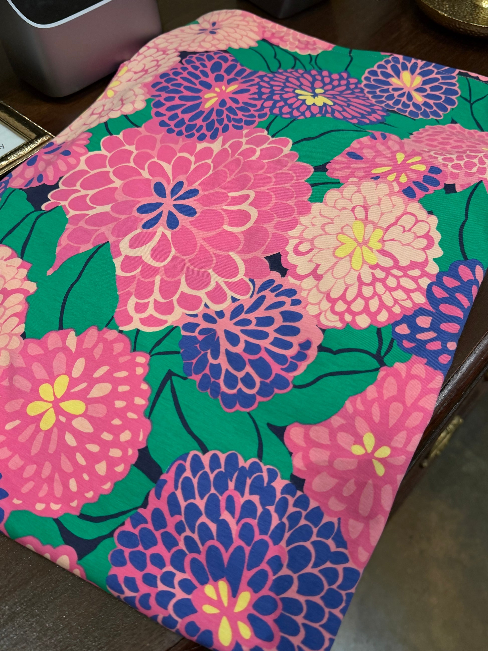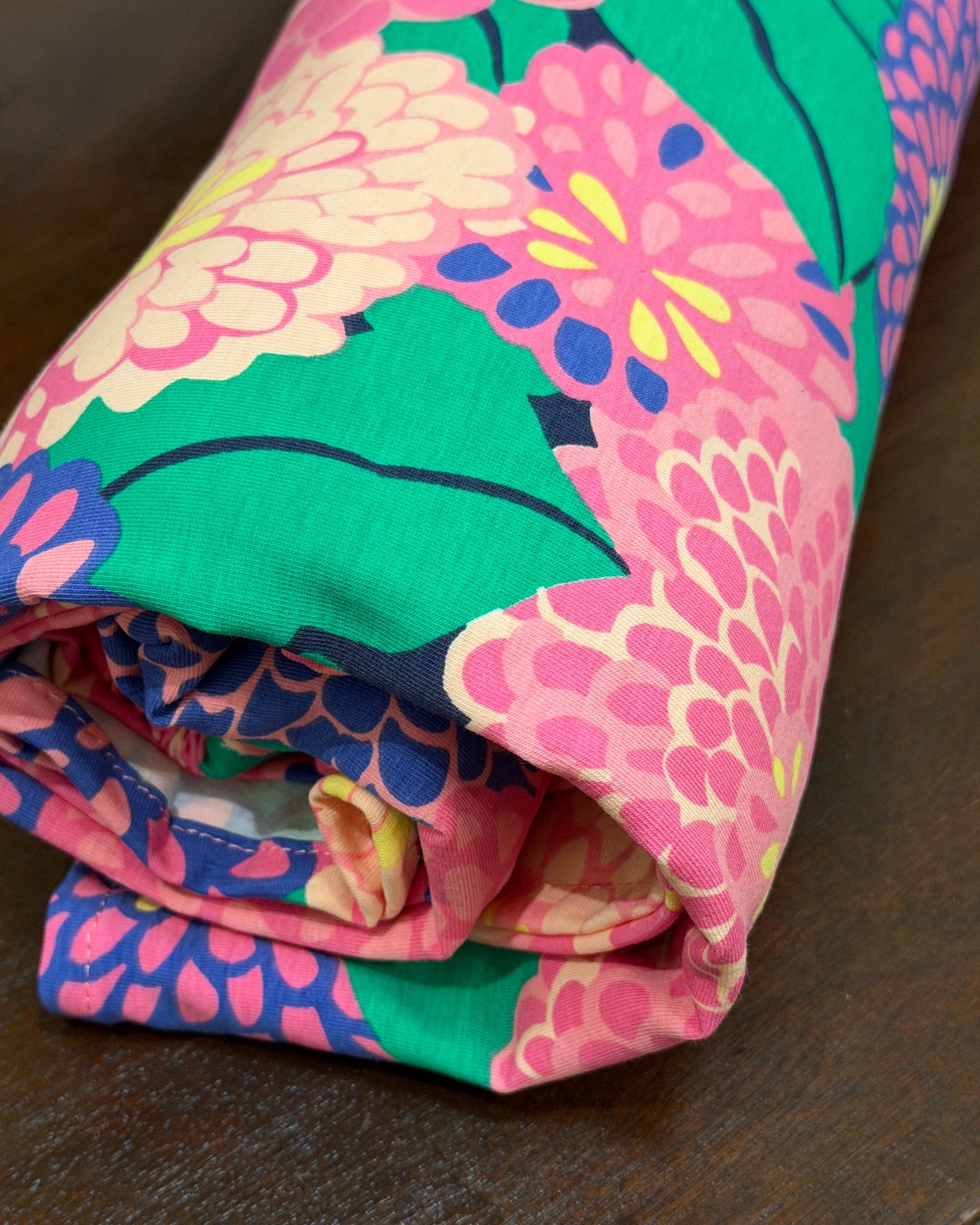 Striking printed two-piece prayer set. Comfort and ease in the perfect prayer garment. What better way to help make each prayer special with the Blooming Jersey Prayer Set.