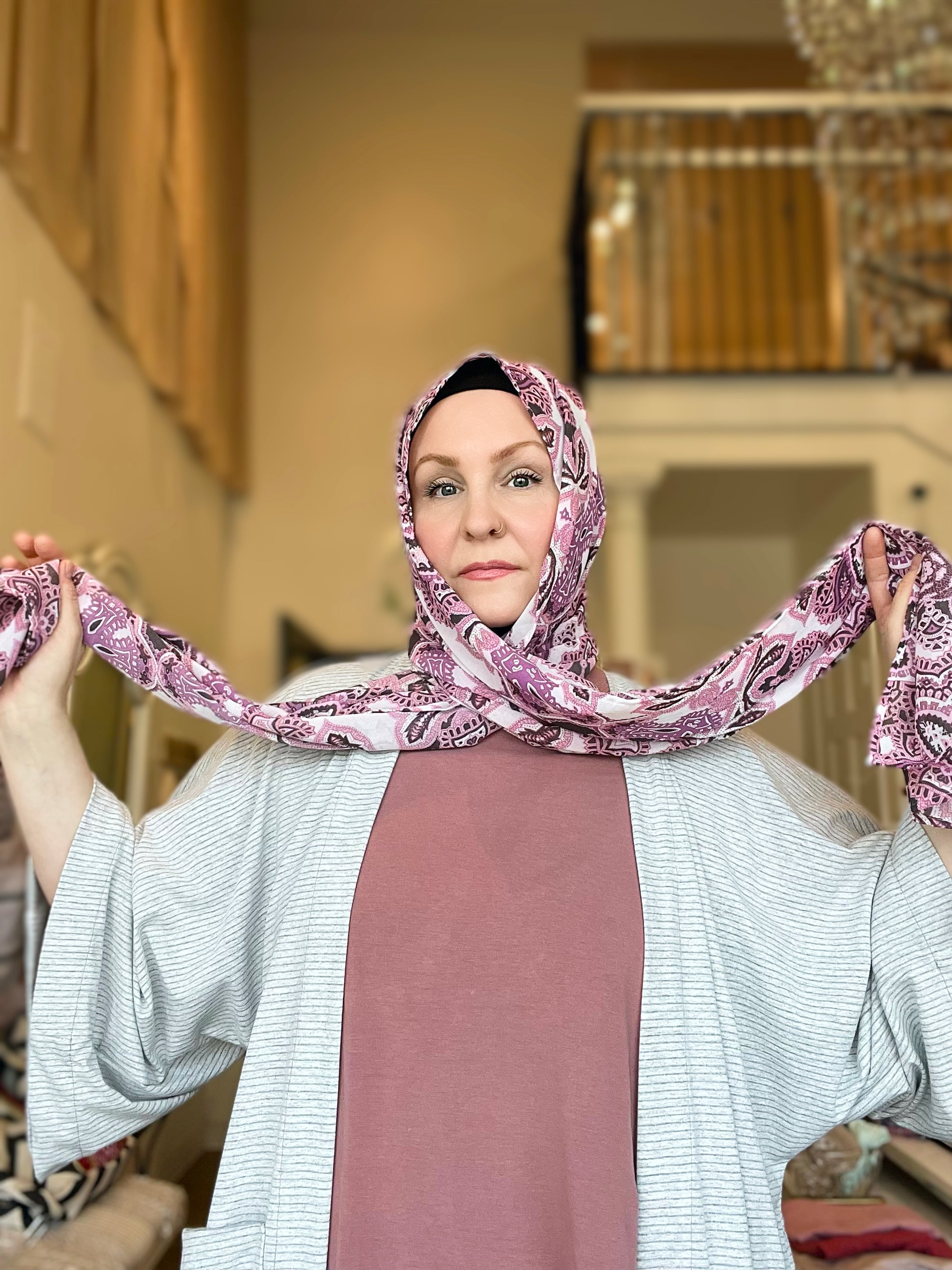 Gorgeous mauve and maroon hues against a white backdrop for an absolutely eye popping hijab.