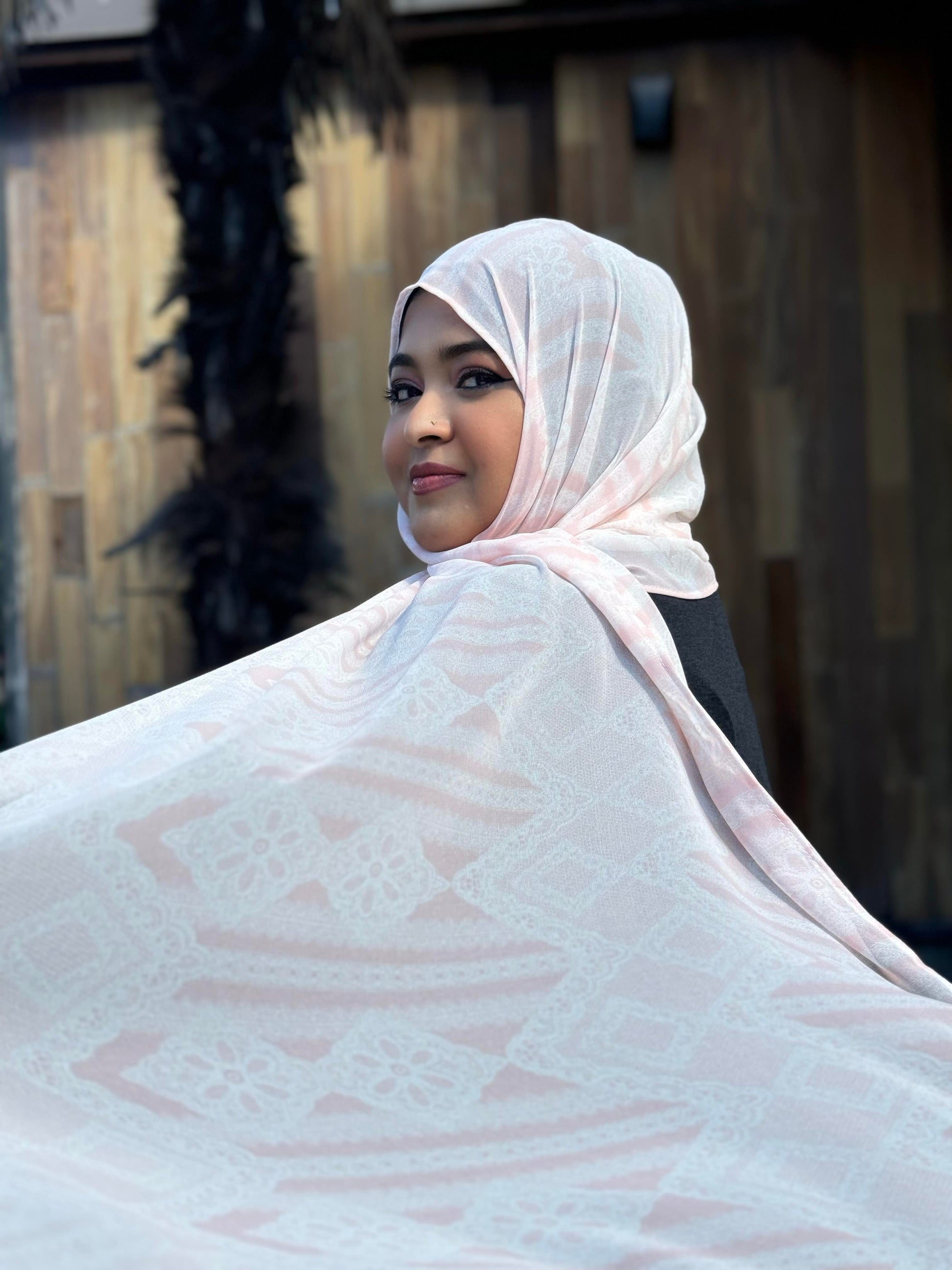 Gorgeous cool pale pink chiffon hijab with the most subtle lace print pattern.
