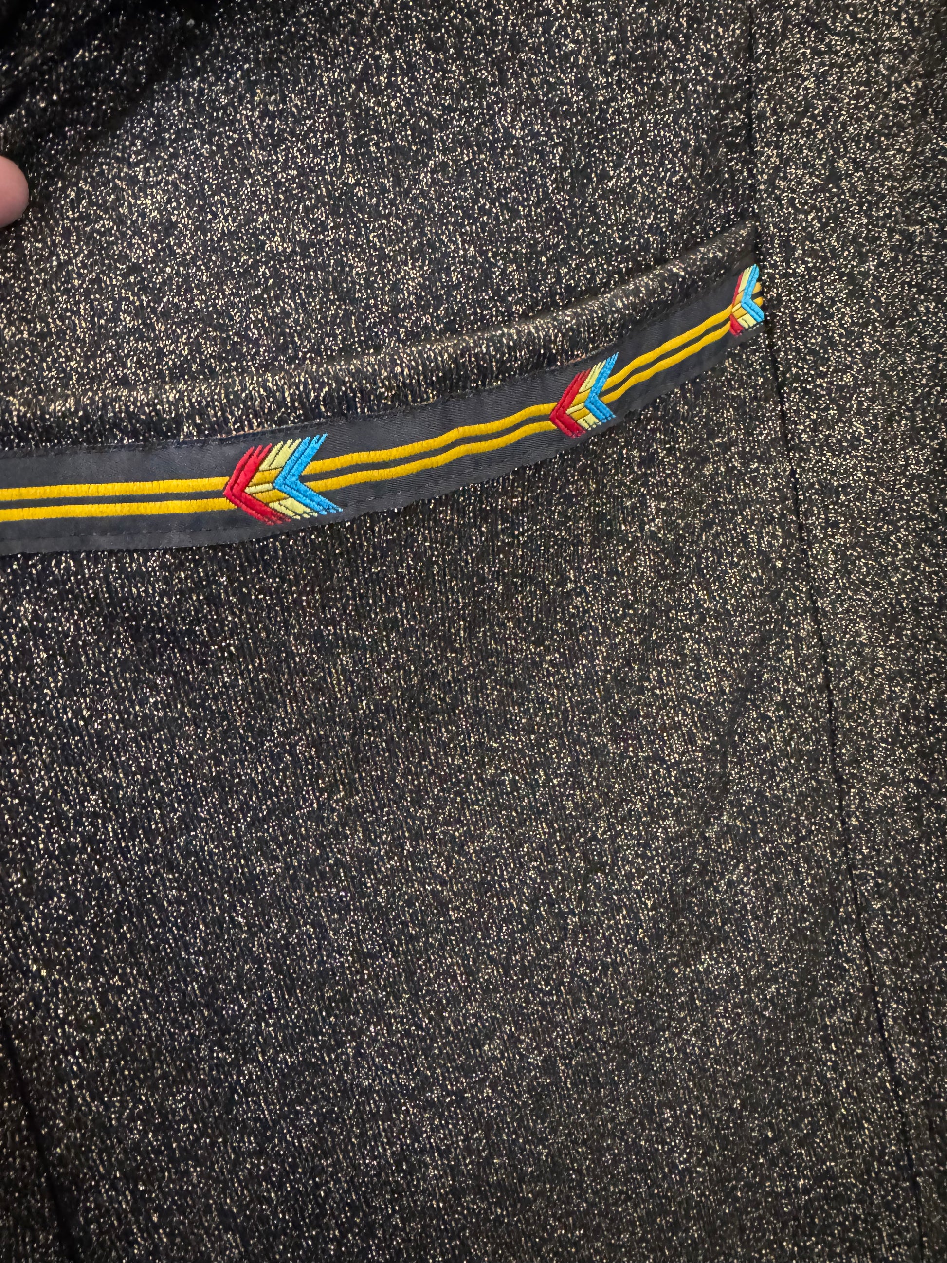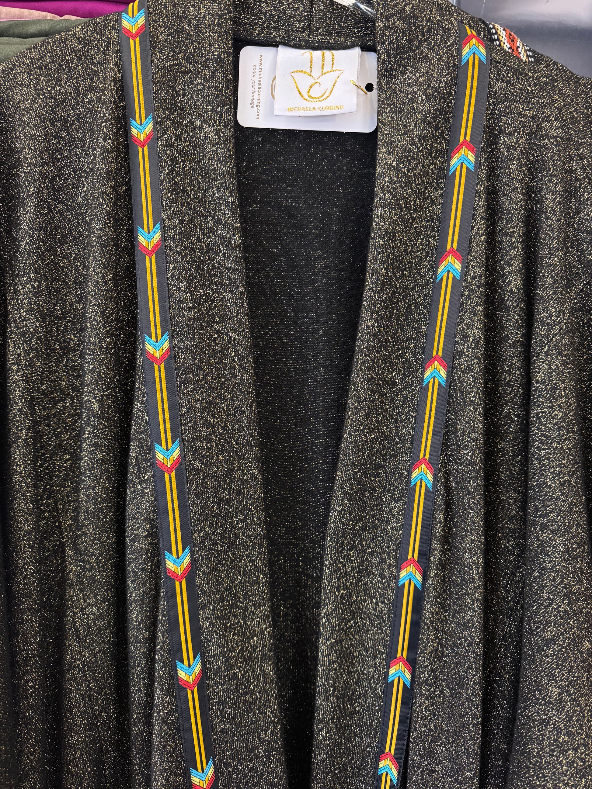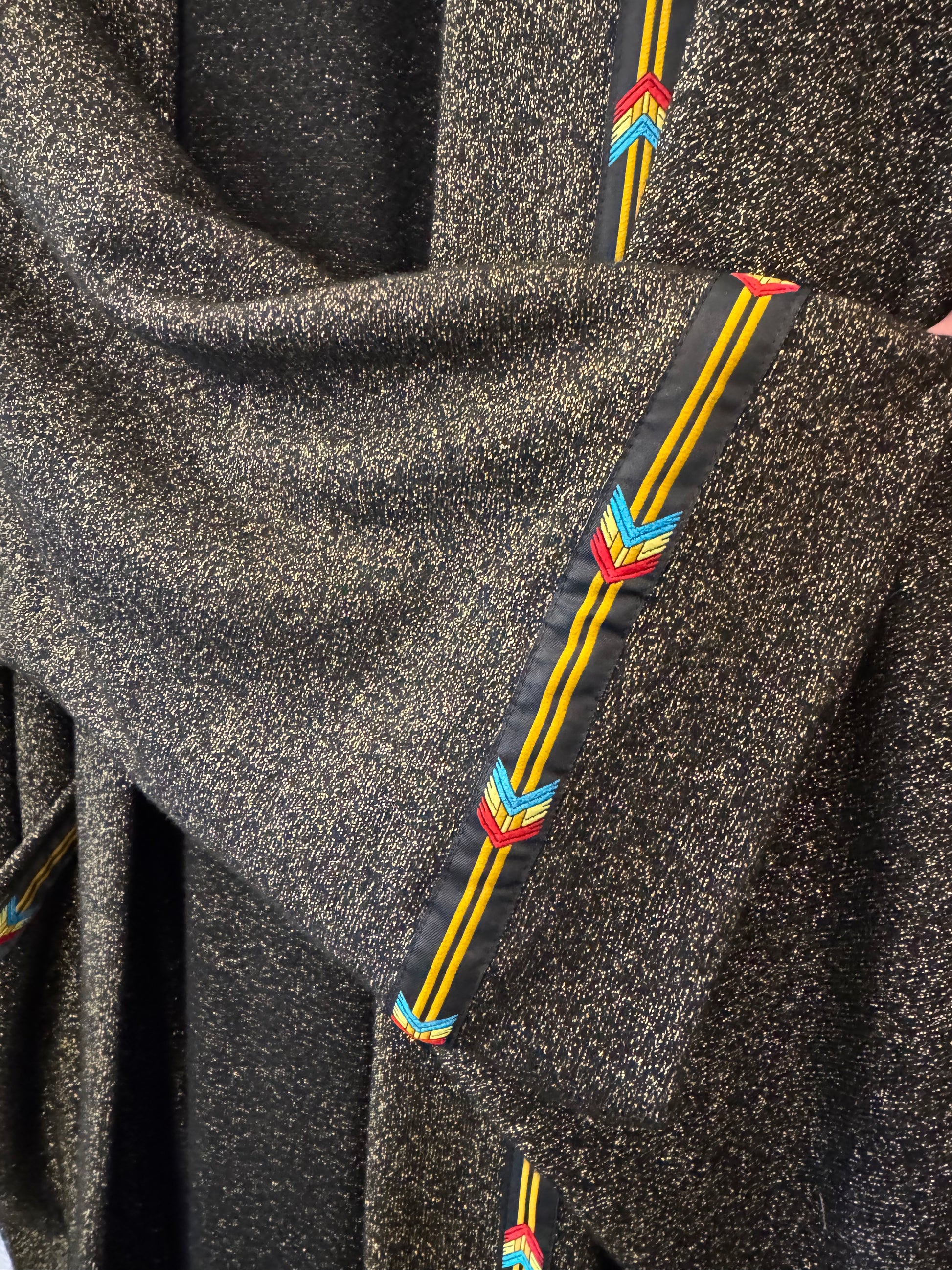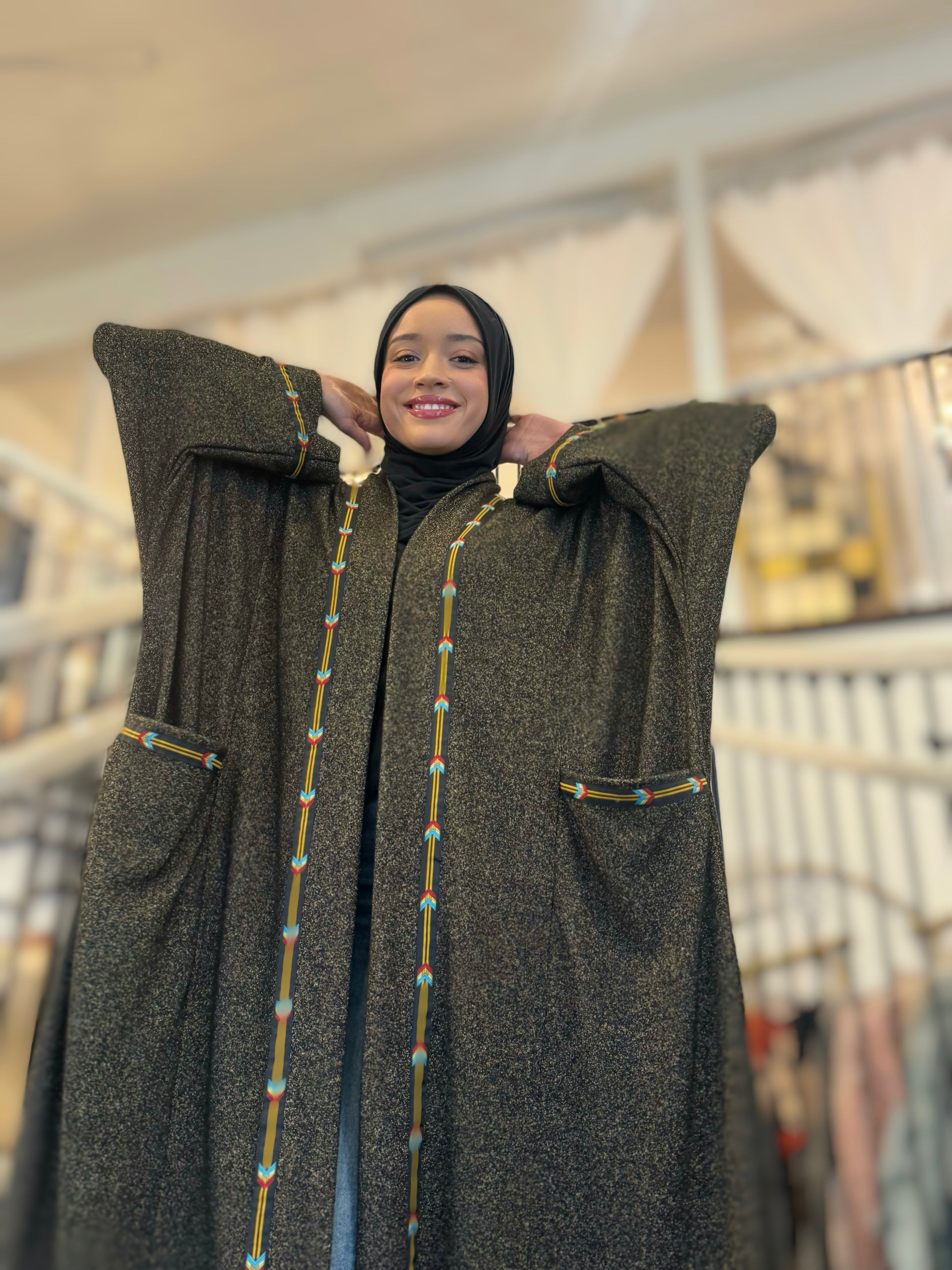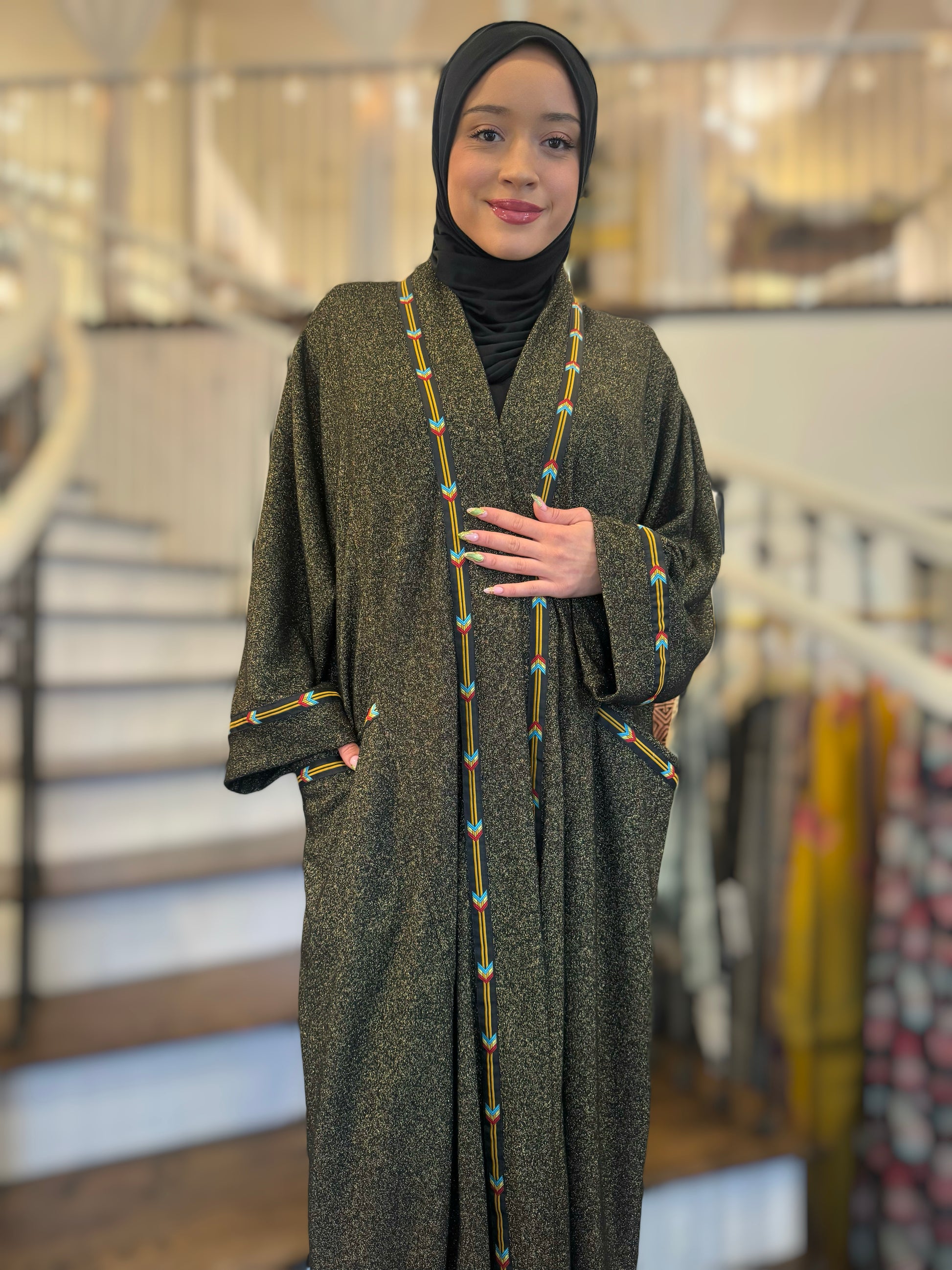 Crafted from a mid-weight sweater knit, this abaya pairs the artistry of heritage design with the comfort of a soft, fluid fabric that’s perfect for cooler weather. The body is made from a metallic gold-black rayon/poly/nylon blend, offering gentle shimmer and a graceful drape. A vivid flechazo trim — in tones of metallic gold, turquoise, red, and black — borders the front and cuffs, echoing arrow motifs that honor lineage, direction, and cultural expression.