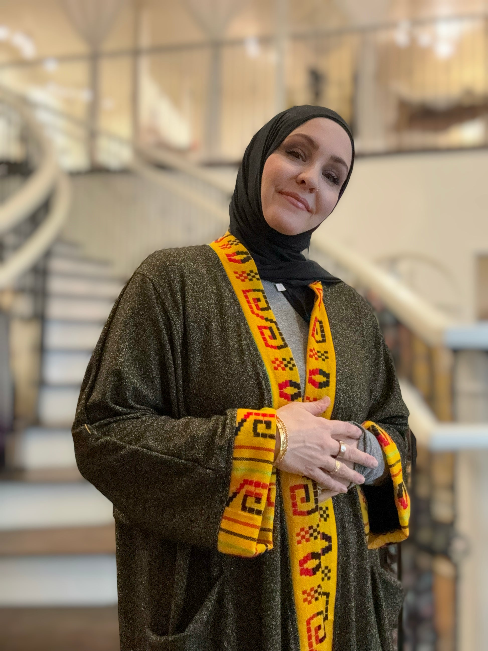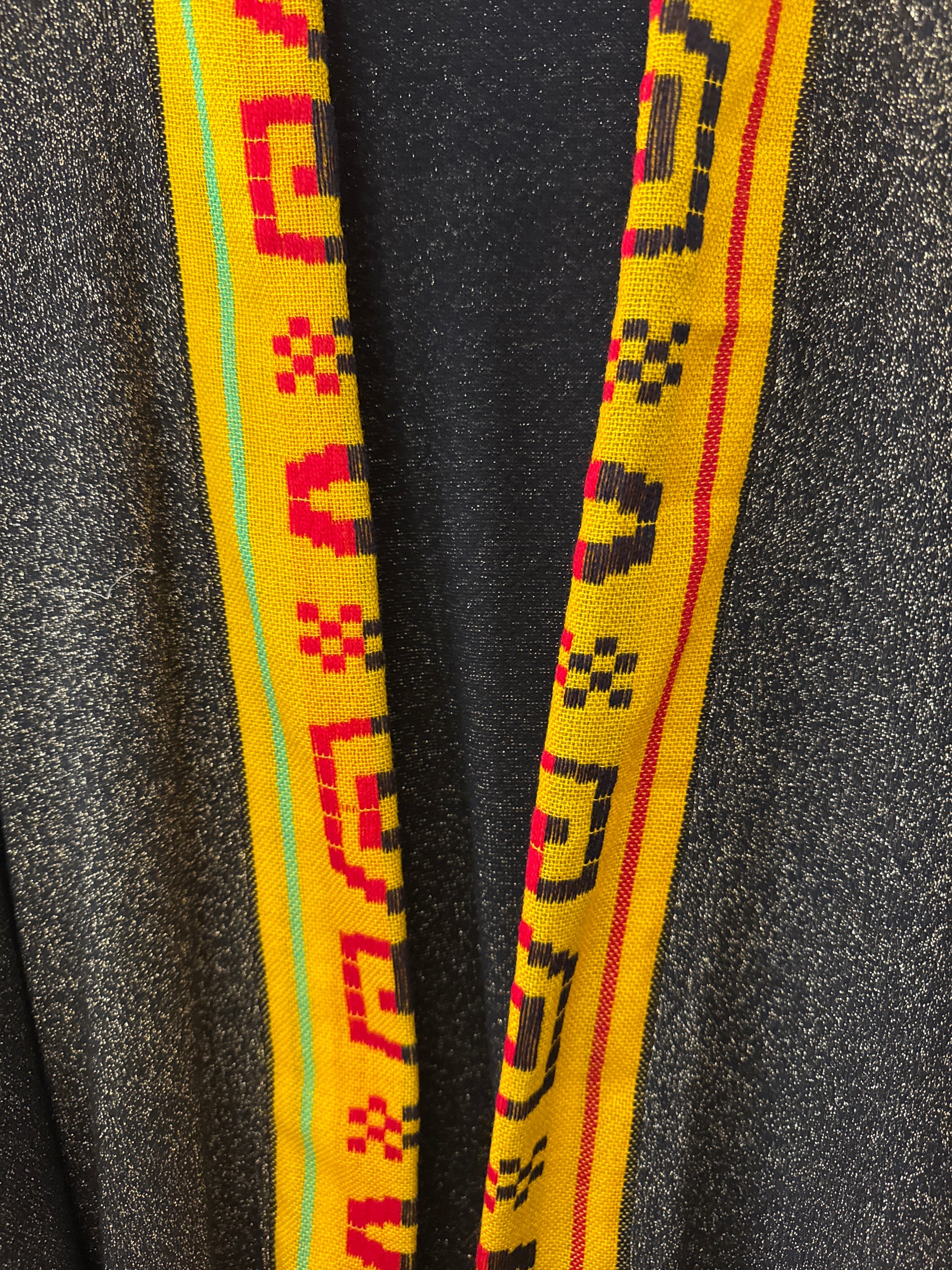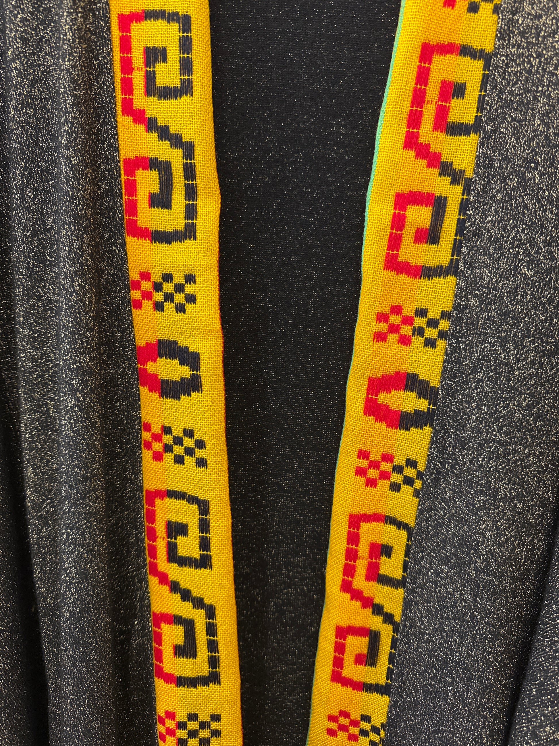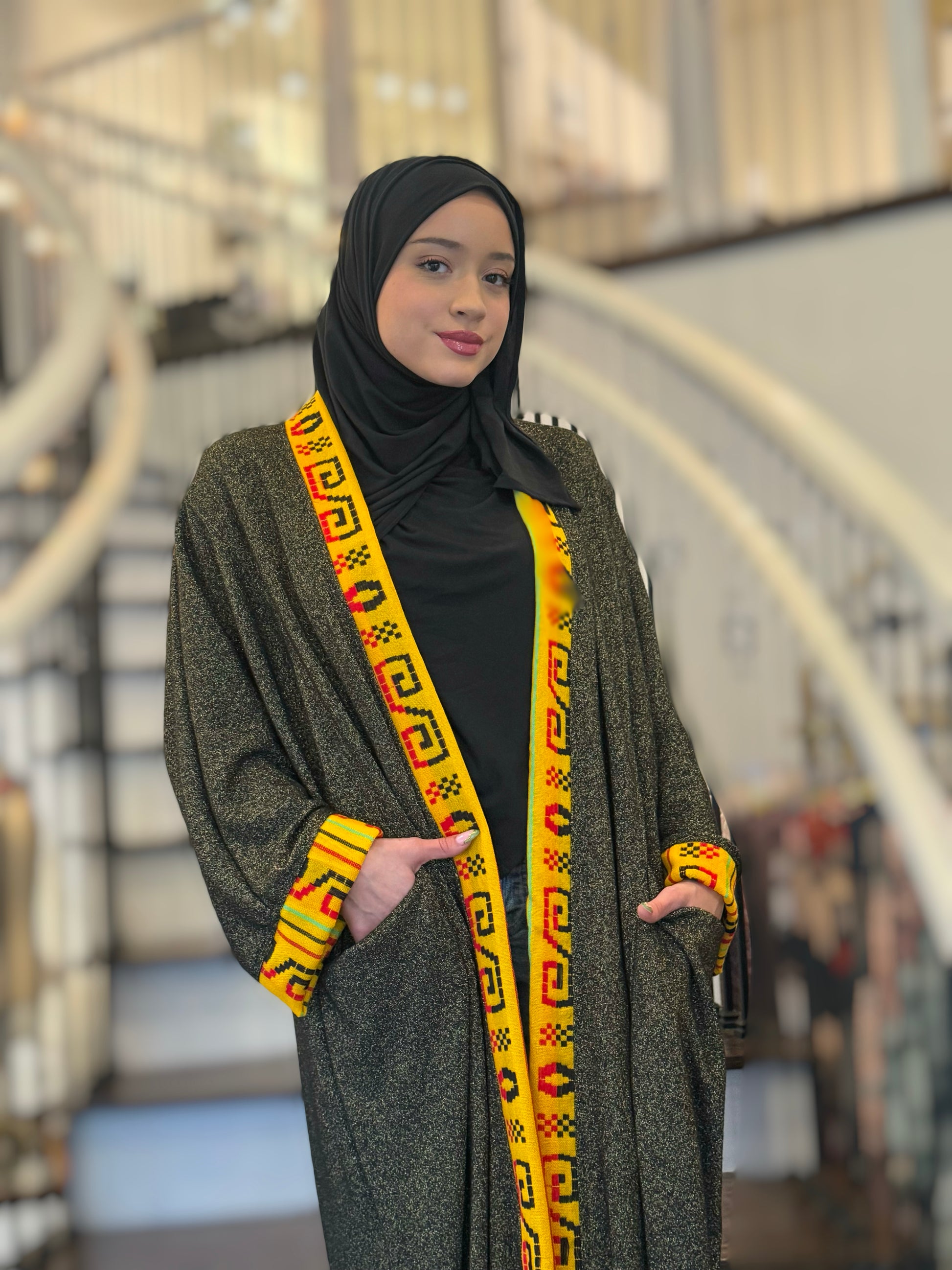 The abaya’s main body is crafted from a metallic gold-black rayon/poly/nylon blend, offering a gentle shimmer and a beautiful drape that moves gracefully with you. A vivid woven trim in tones of mustard gold, red, and black, authentic Mexican textiles, borders the front and cuffs — each geometric motif honoring traditional craftsmanship and the beauty of cultural expression.