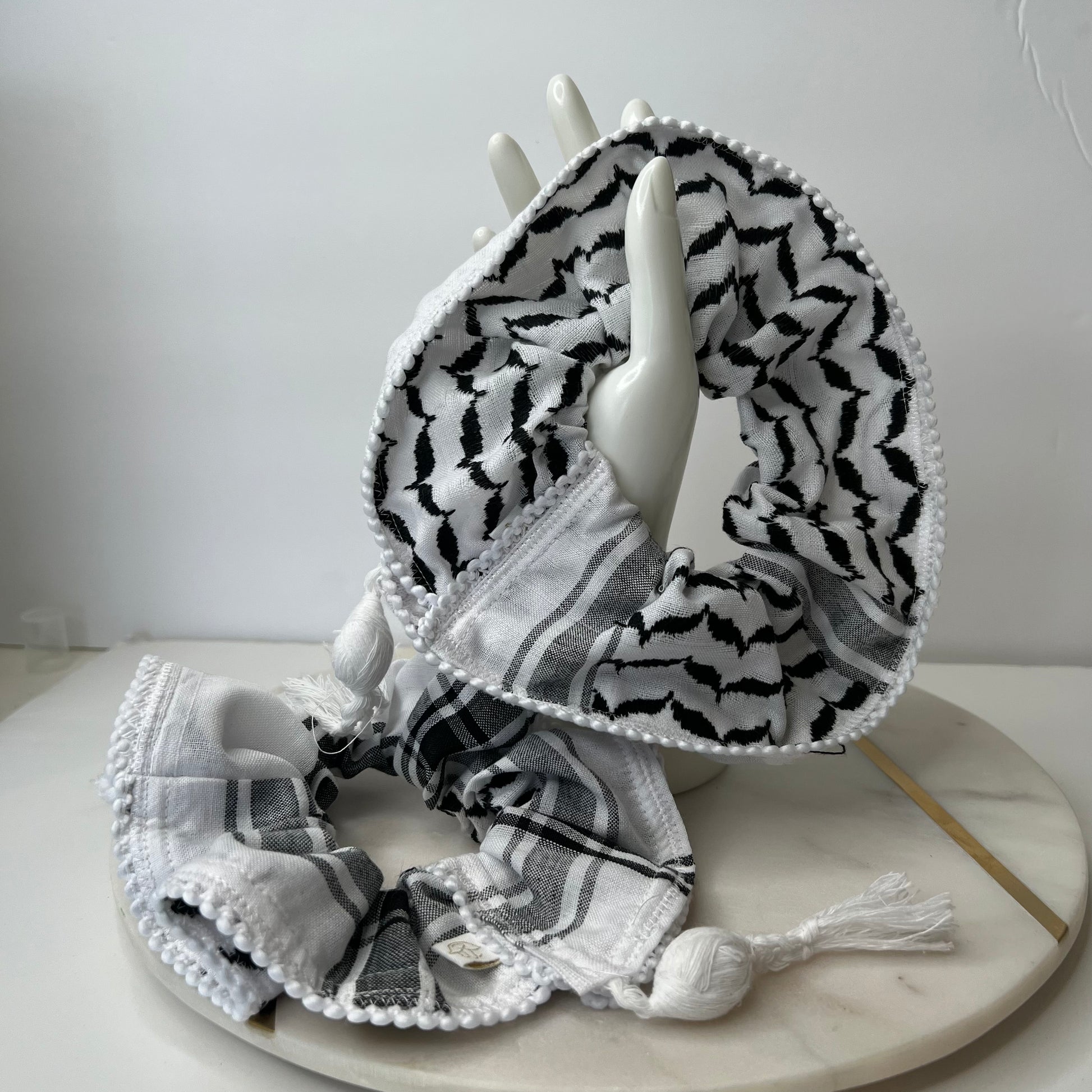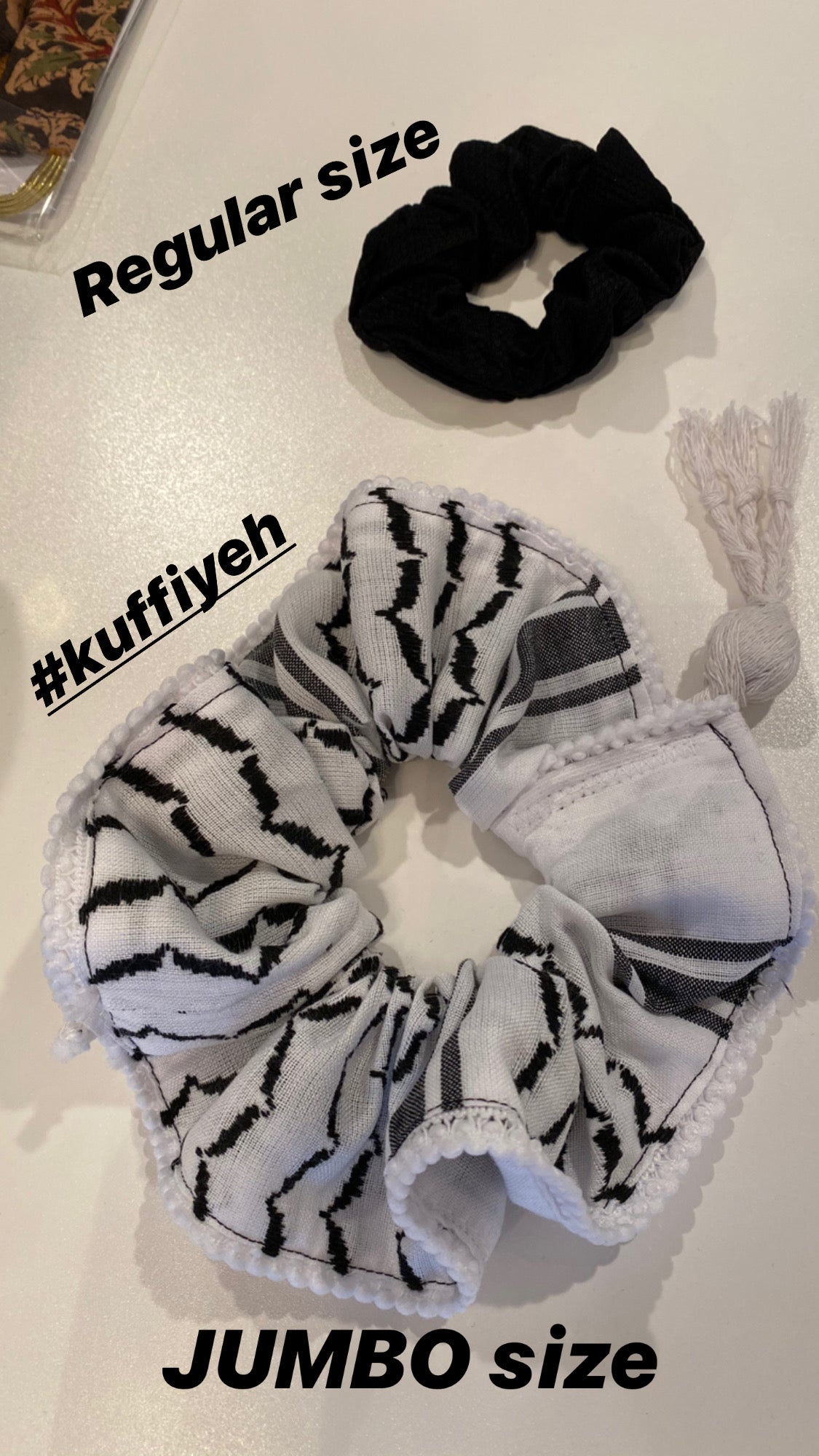 Each jumbo scrunchie was made with authentic Palestinian kuffiya fabric from Hebron. Your purchase supports this factory even though the scrunchies are made here in Seattle, WA.