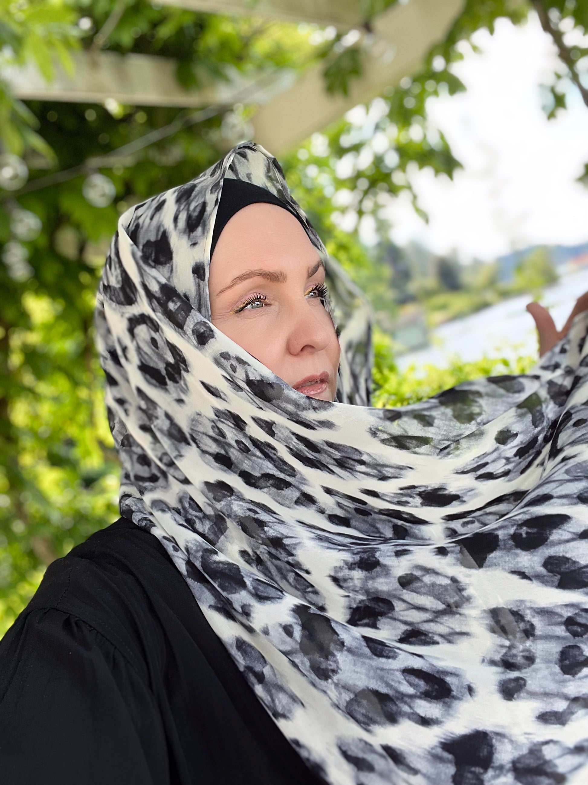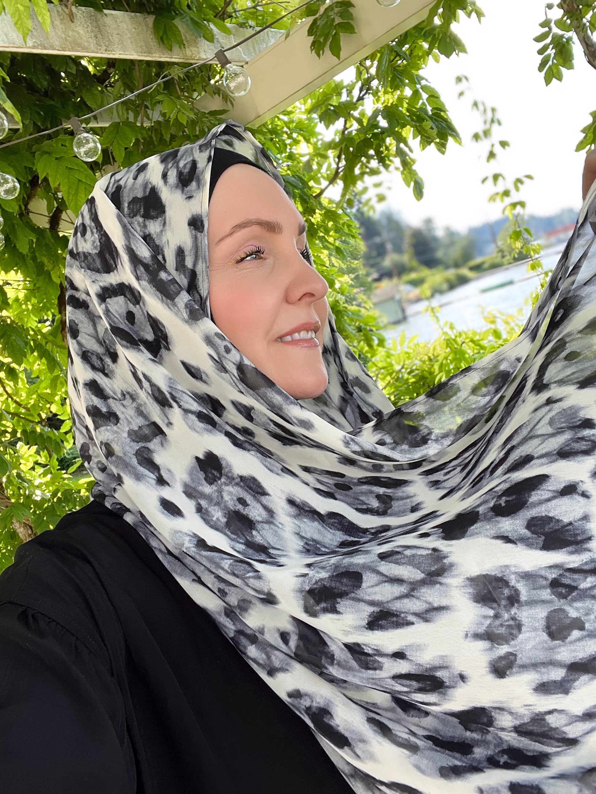 Color: Shadow gray, alabaster, slate gray leopard pattern. Pattern placement may vary.
