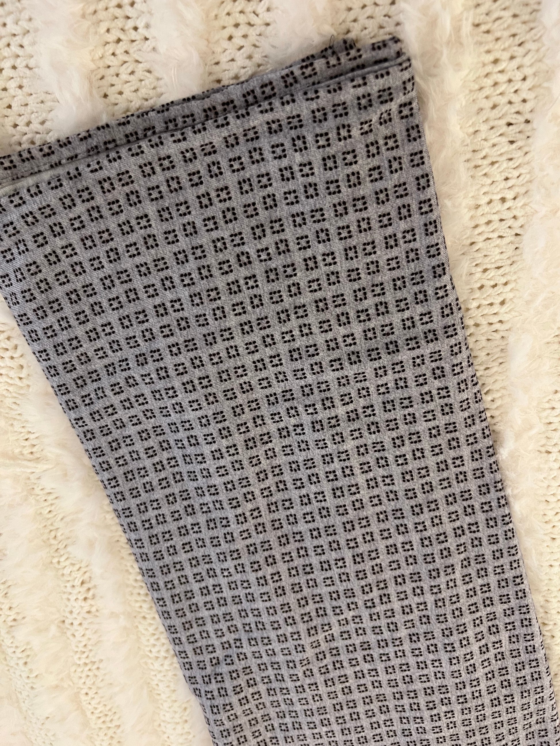 Color: Grey back ground with small square designs. White underside. Pattern placement may vary.