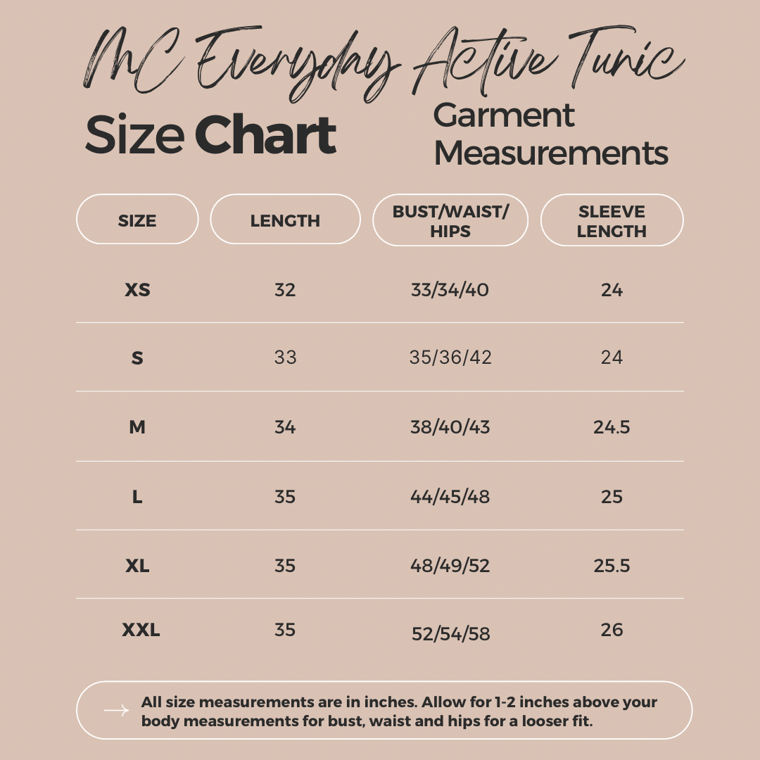 - Approximate length of a size Medium is 34" long, which is 5" shorter than the "MC Everyday Tunic".