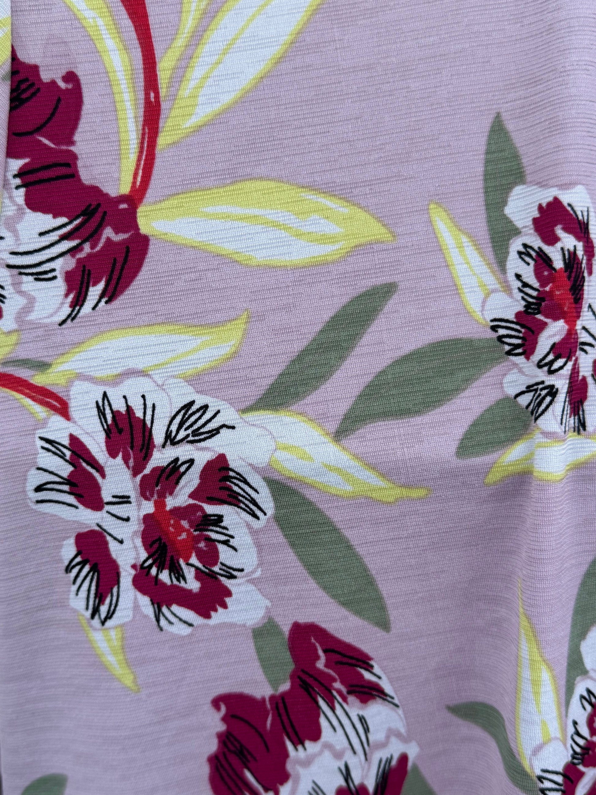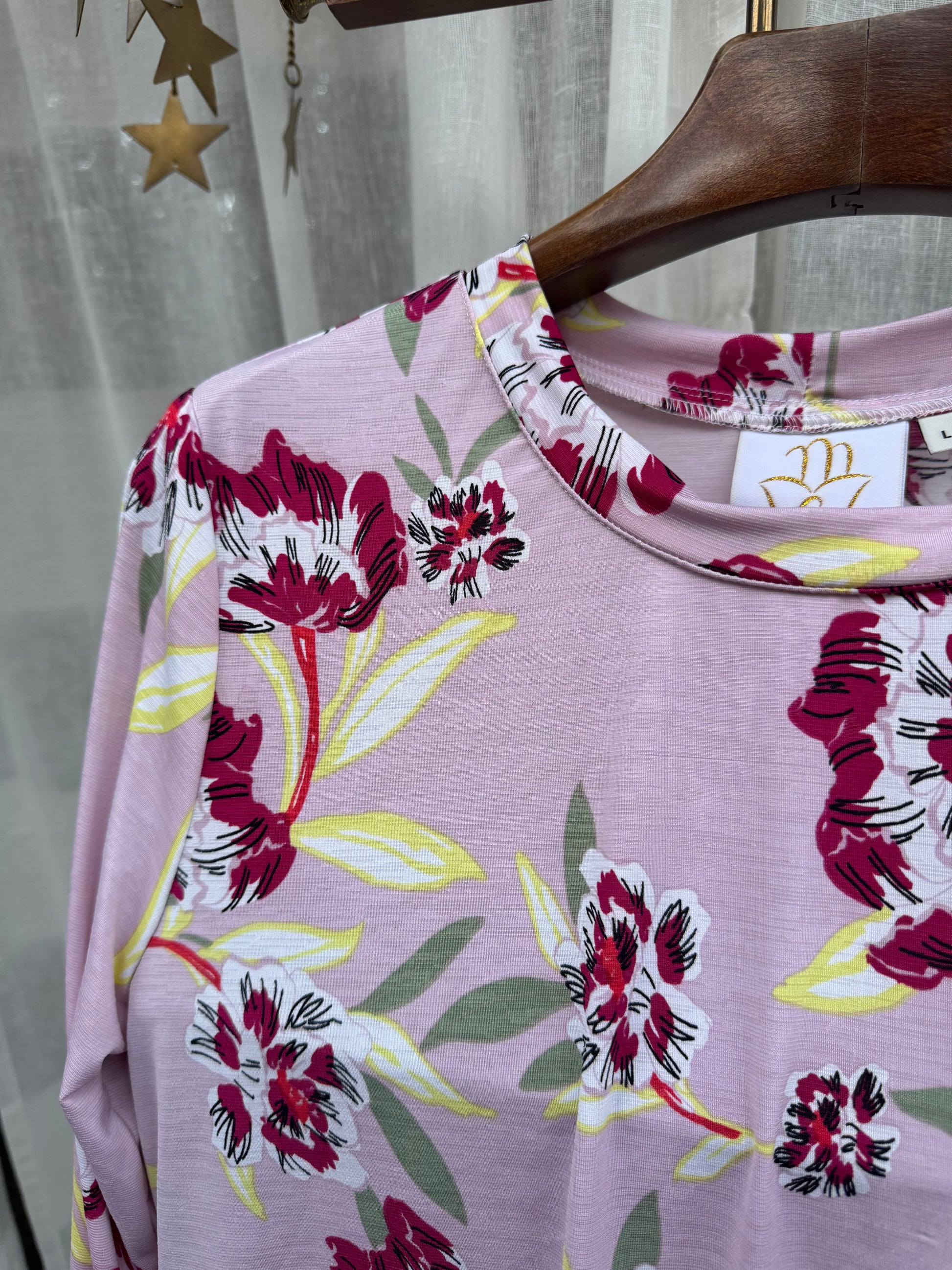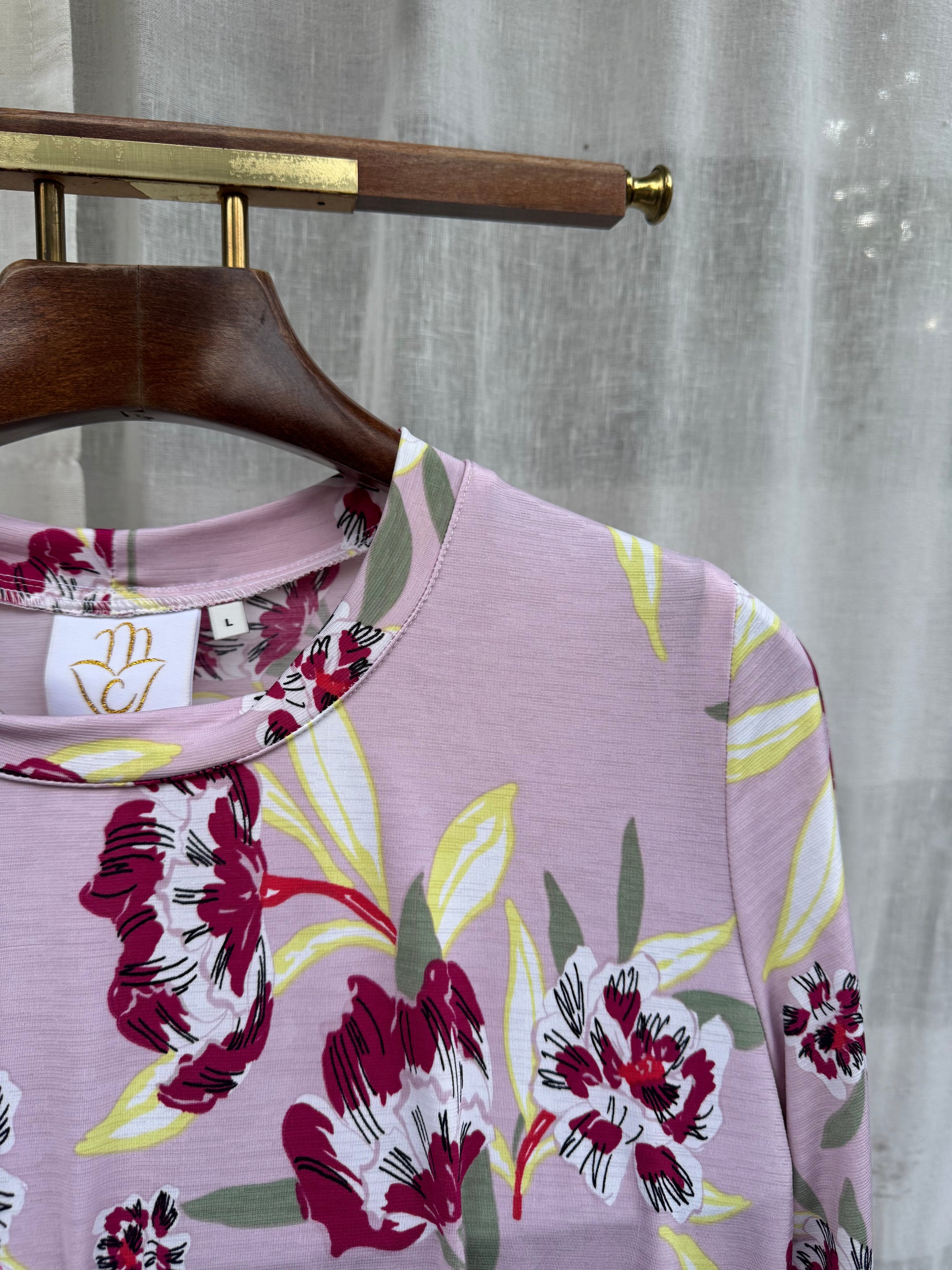 This tunic brings springtime energy to your wardrobe with its lilac base and vibrant orchid-inspired florals. Deep magenta petals, ivory accents, and sunny yellow details are balanced with fresh green leaves. Lightweight, comfortable, and flowy—perfect for elevating casual outfits or layering for special occasions.