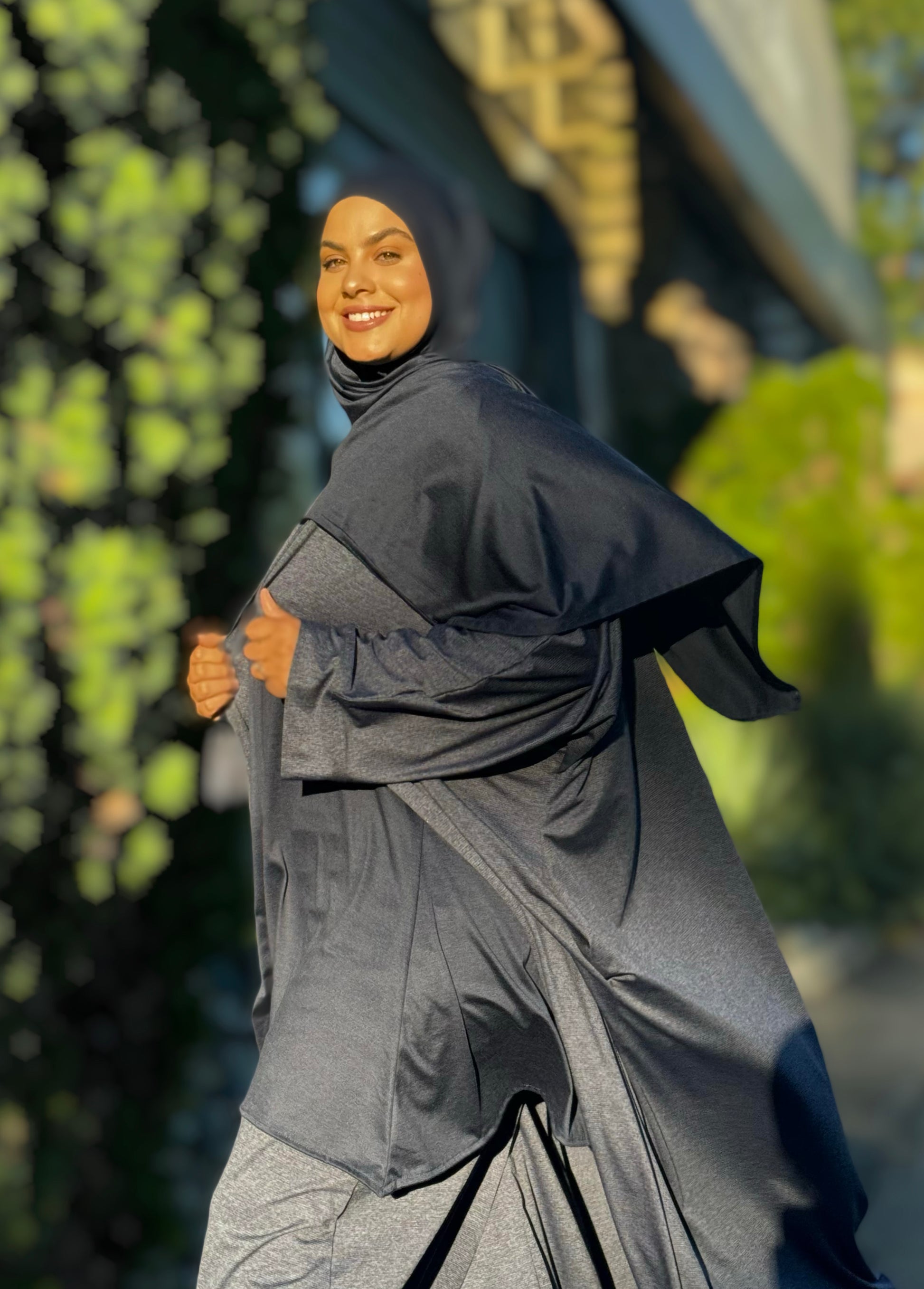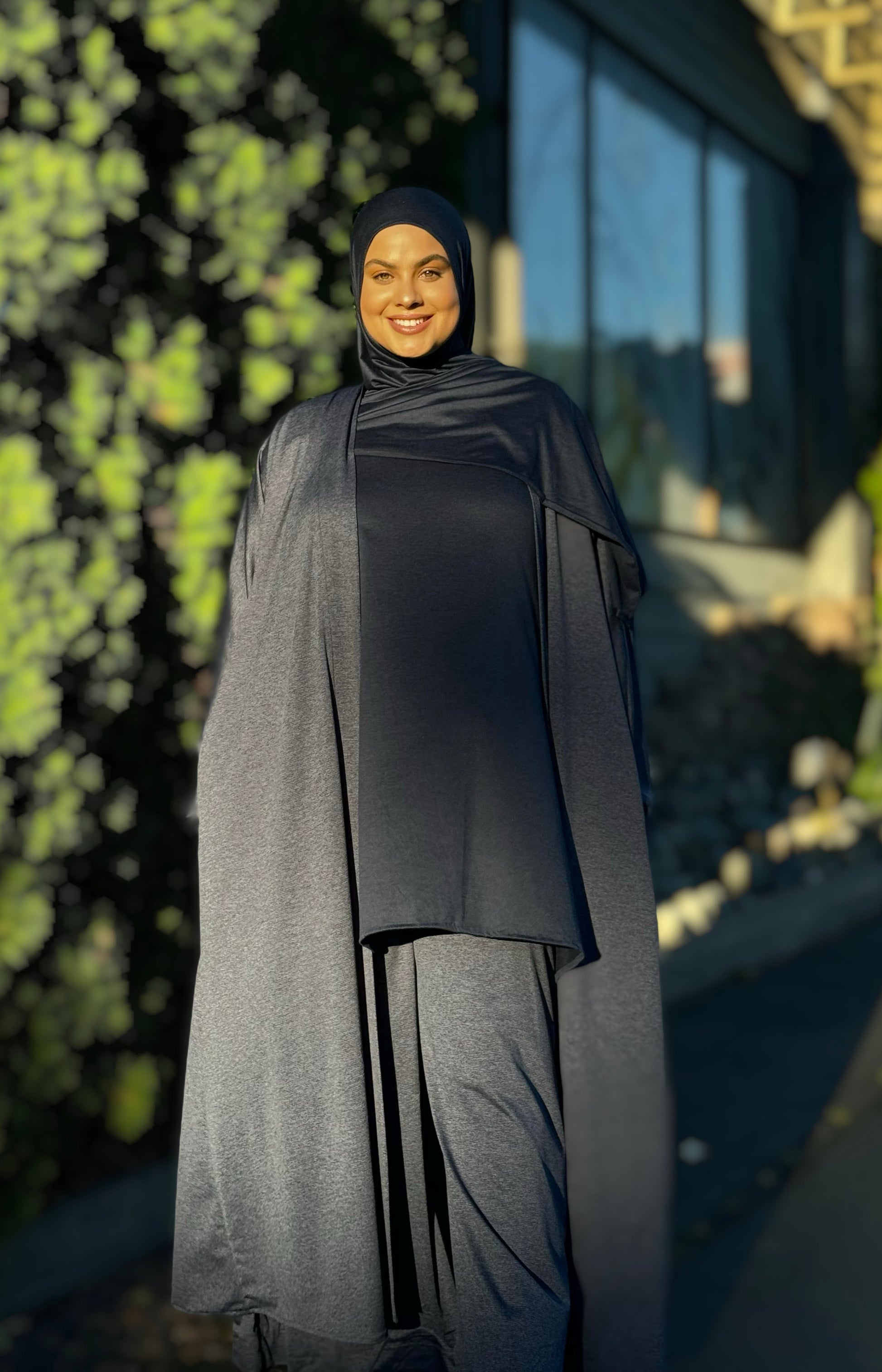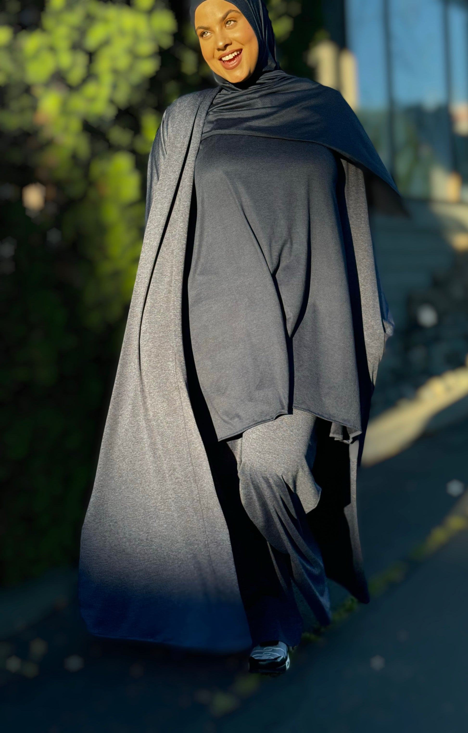 Melia is wearing this tunic with the Nour Abaya in Muted Navy and the matching palazzo pants.