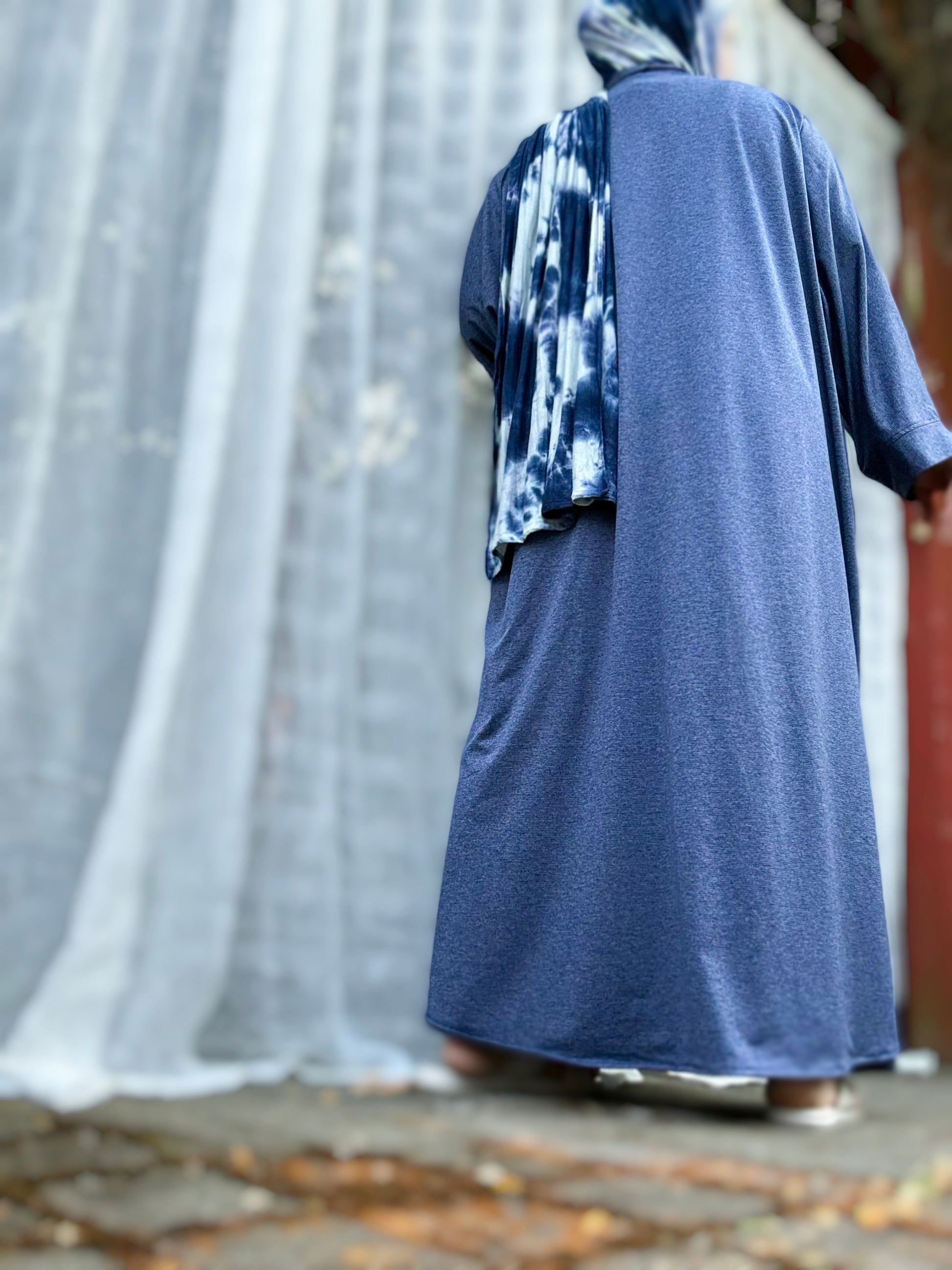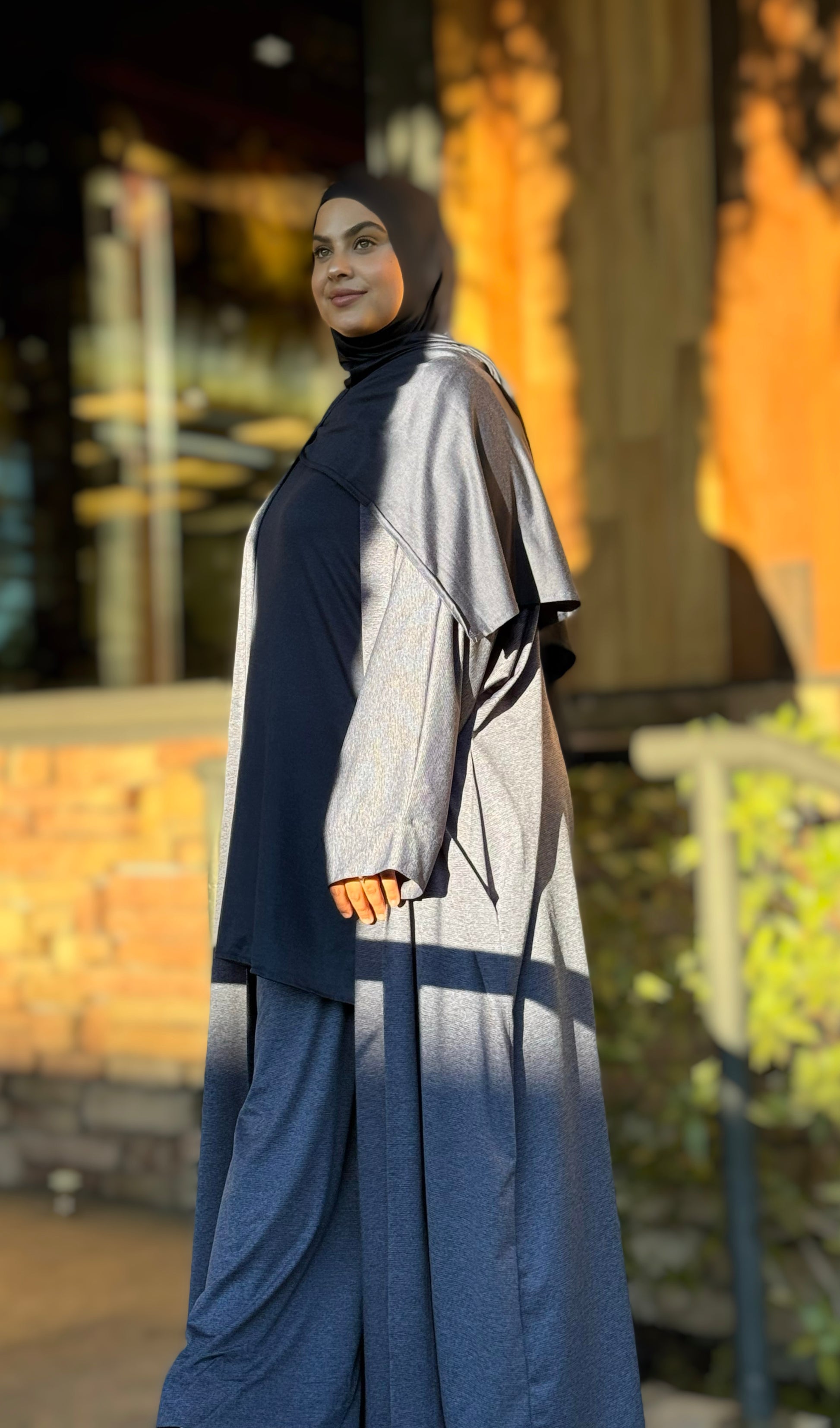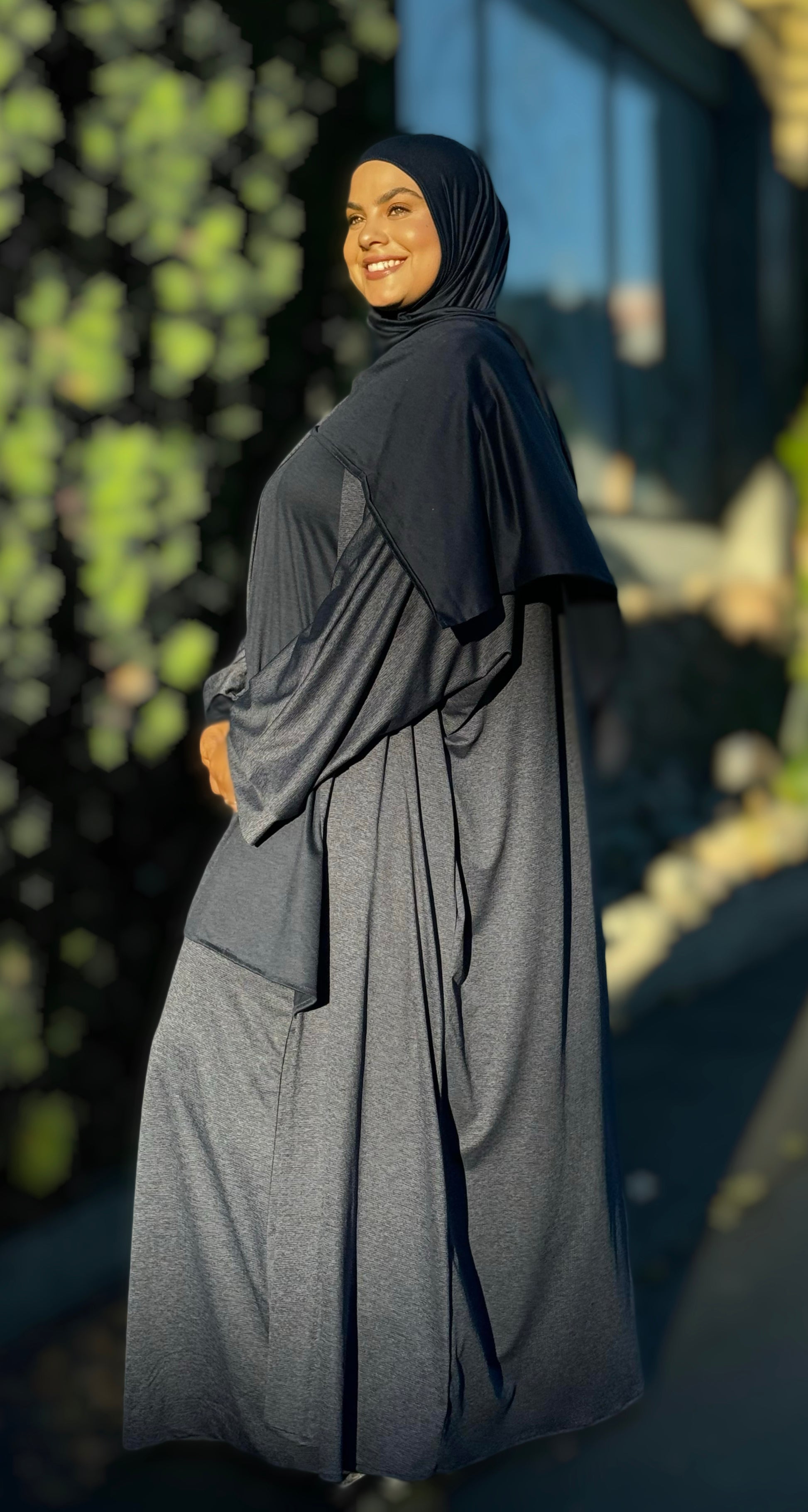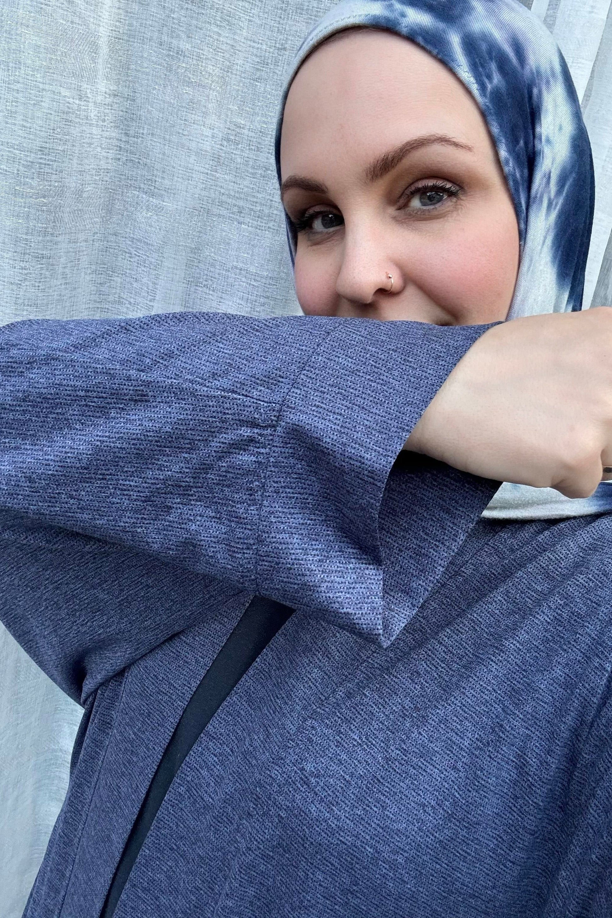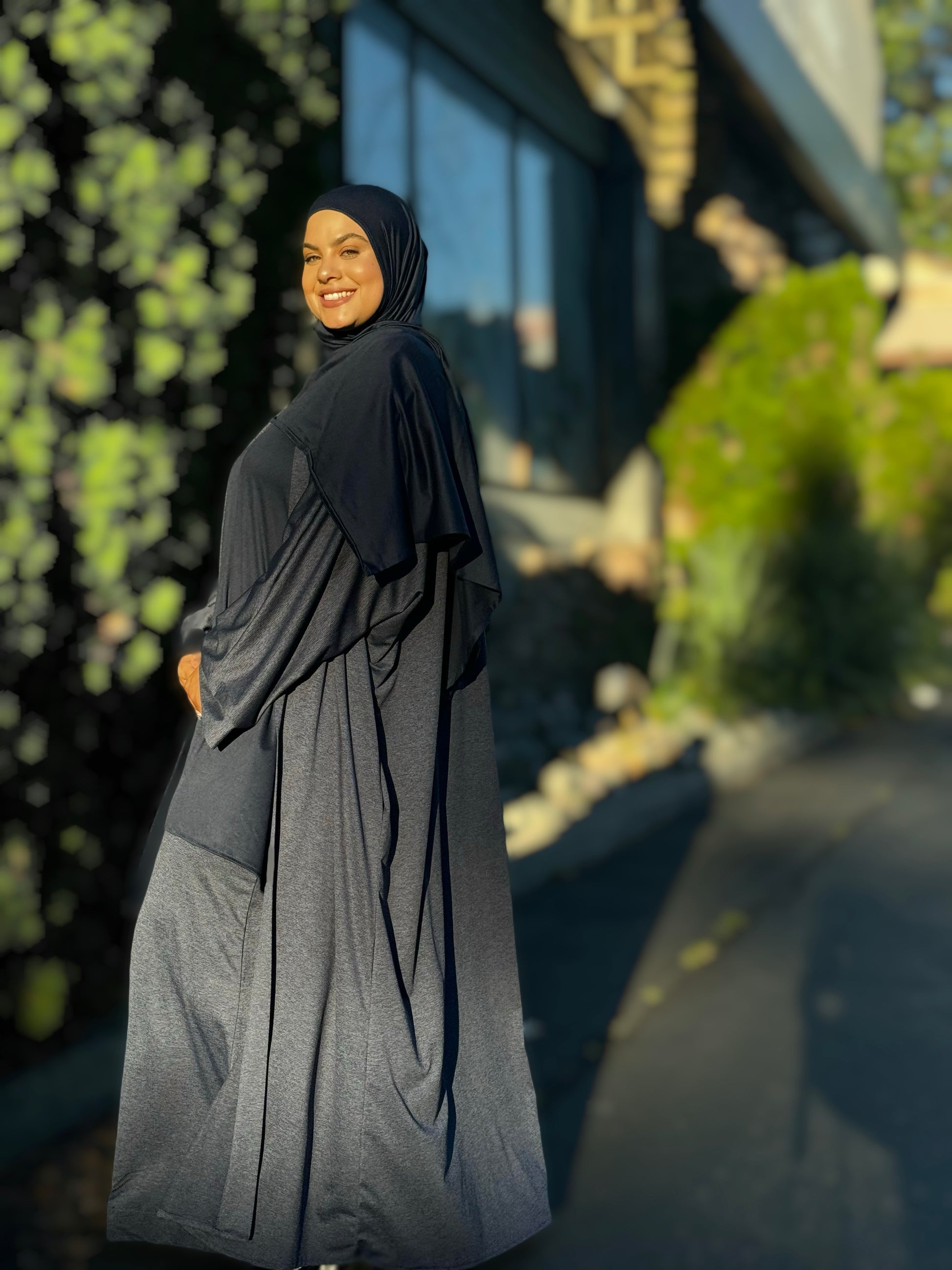 Michaela has been living in this abaya all summer! And it will be a perfect transition piece to fall as well. It's light and airy - a true athleisure abaya made from athletic performance fabric with micro perforations for breathability but not transparent. It has a slight crispness to it so has slightly more structure than the majority of the performance hijabs. It is the perfect shade of muted navy that seems to go with everything.