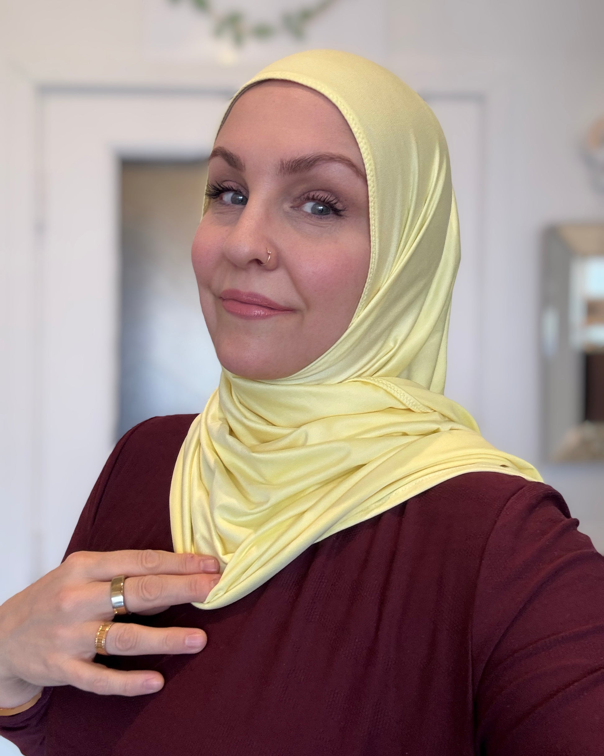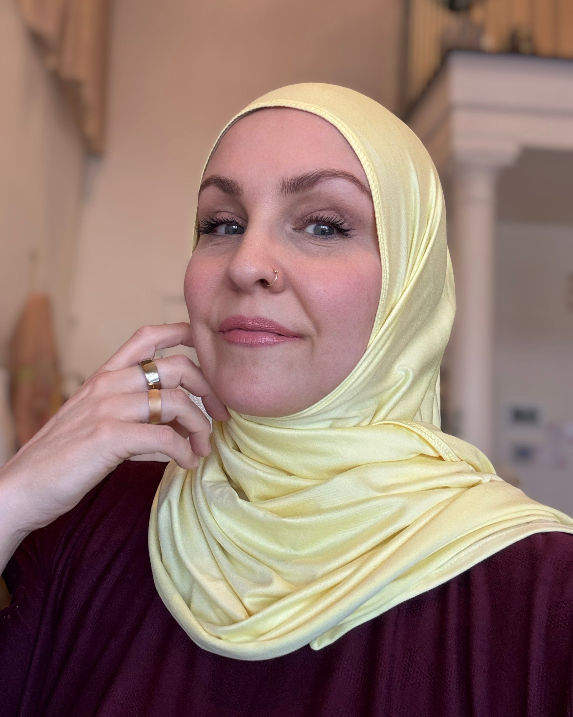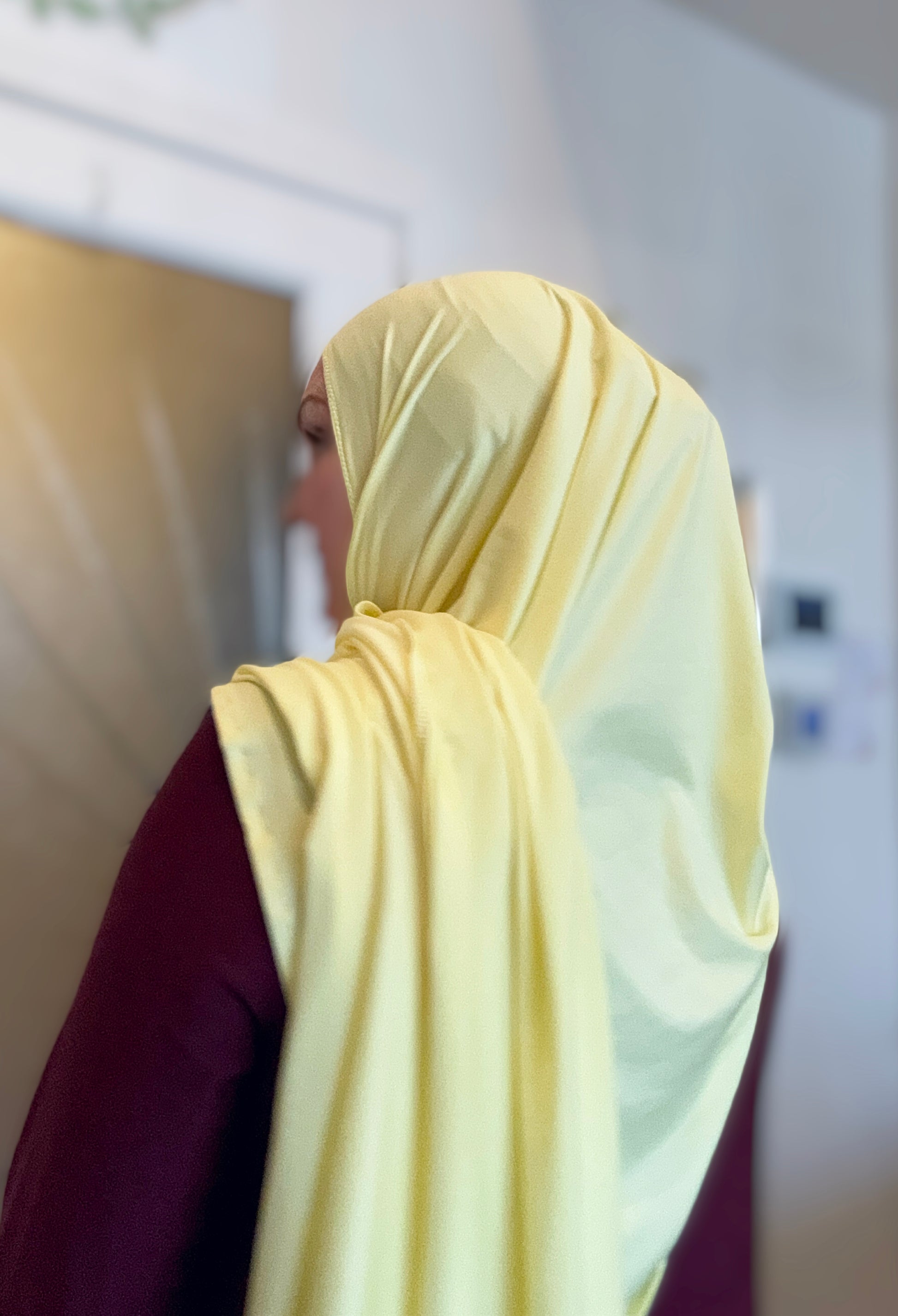 This hijab comes in a soft buttercream yellow, a delicate shade that blends the warmth of pale gold with the freshness of springtime light. The subtle sheen gives it an elegant glow, making it versatile enough for both everyday wear and special occasions. Its gentle hue flatters a wide range of skin tones and pairs beautifully with neutrals, pastels, and jewel tones.