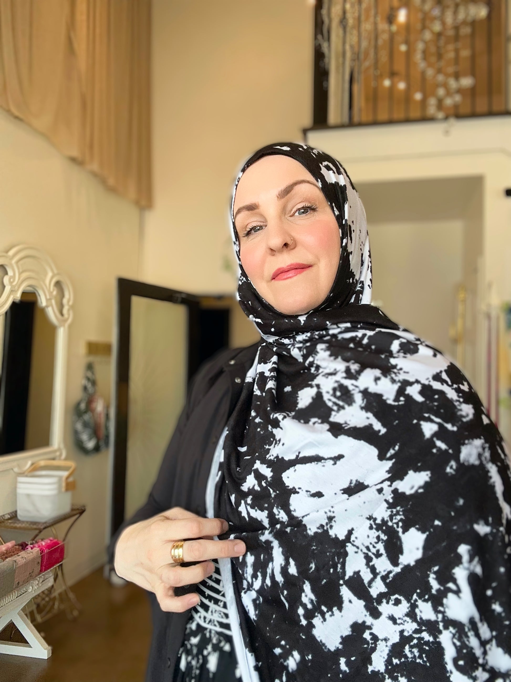 Like thew inkblot test, this hijab will keep you guessing - what is that design or image that is appearing in that abstract design?