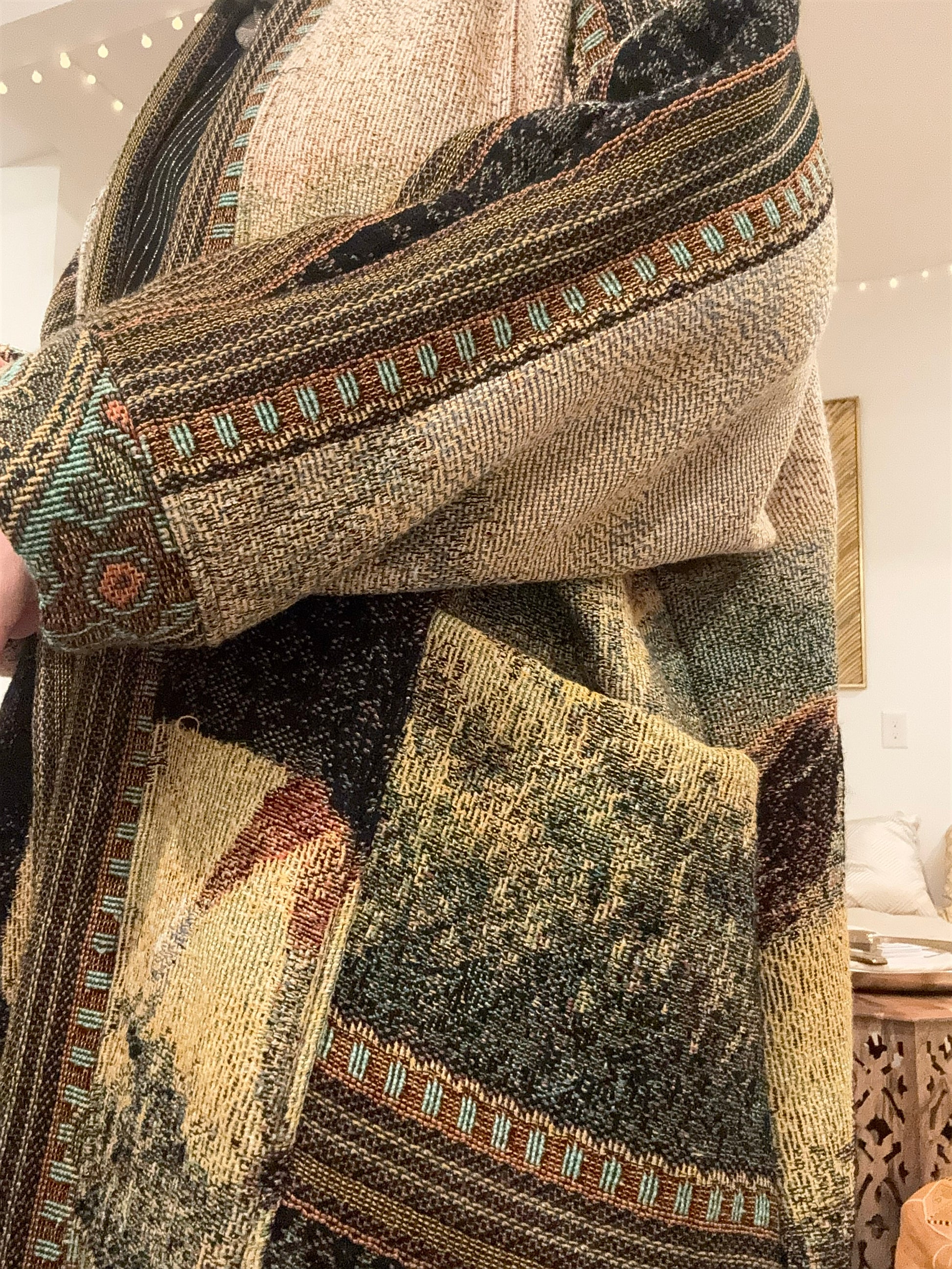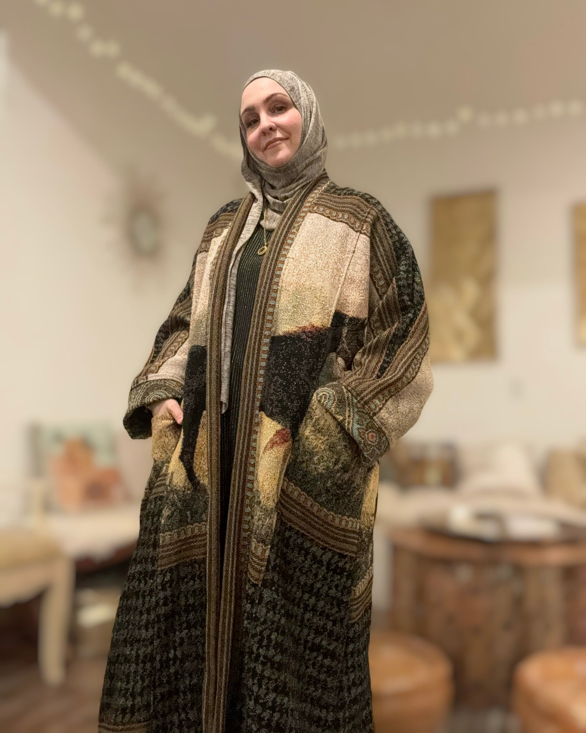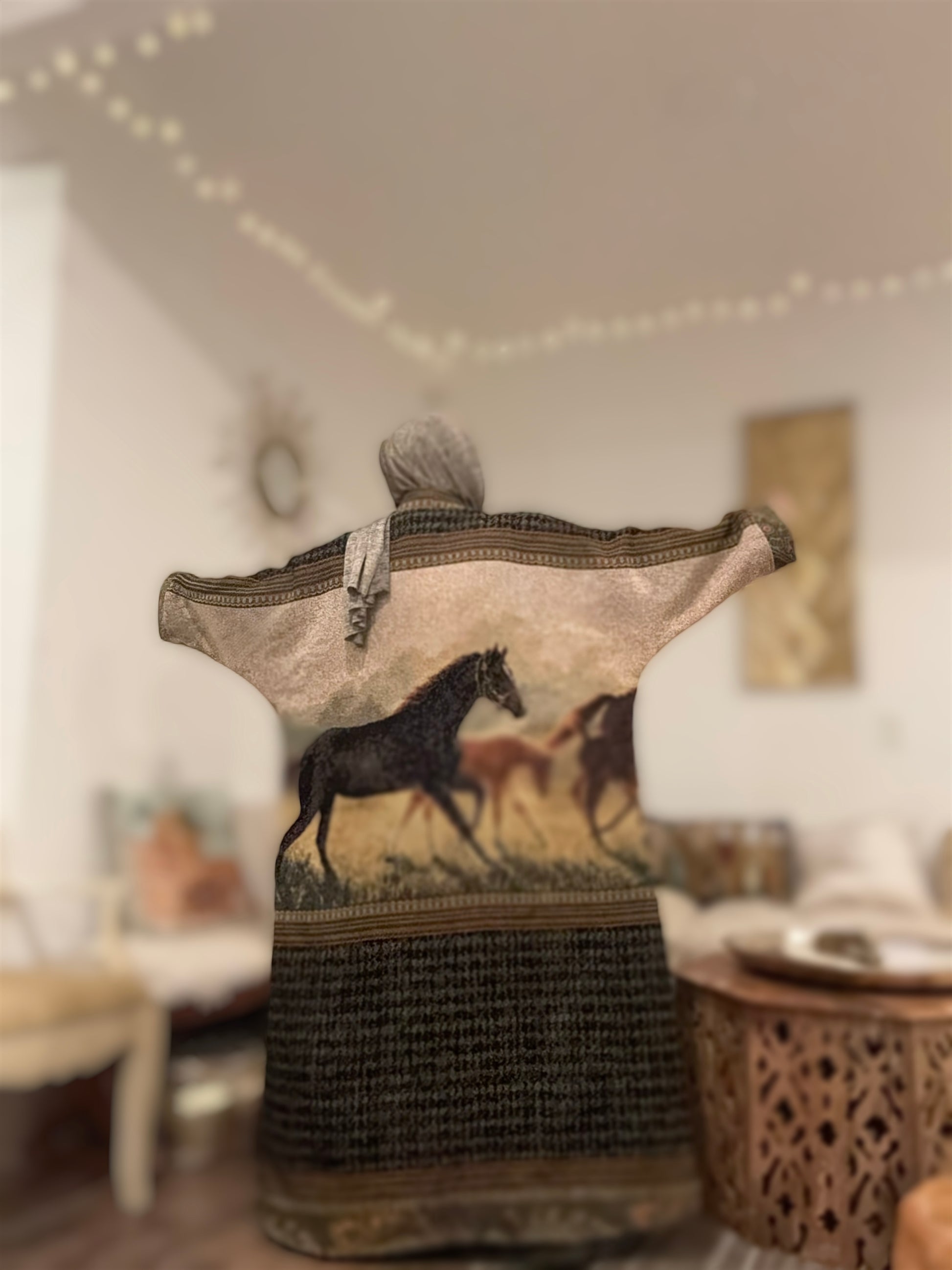This Al-Furūsiyya (الـفروسـيّة) — Arabic for horsemanship / noble chivalry — Pocket Anorak Abaya is handcrafted from an upcycled woven blanket and transformed into a wearable storytelling piece. The back features a striking scene of galloping horses across golden grasslands, evoking freedom, strength, and timeless beauty.