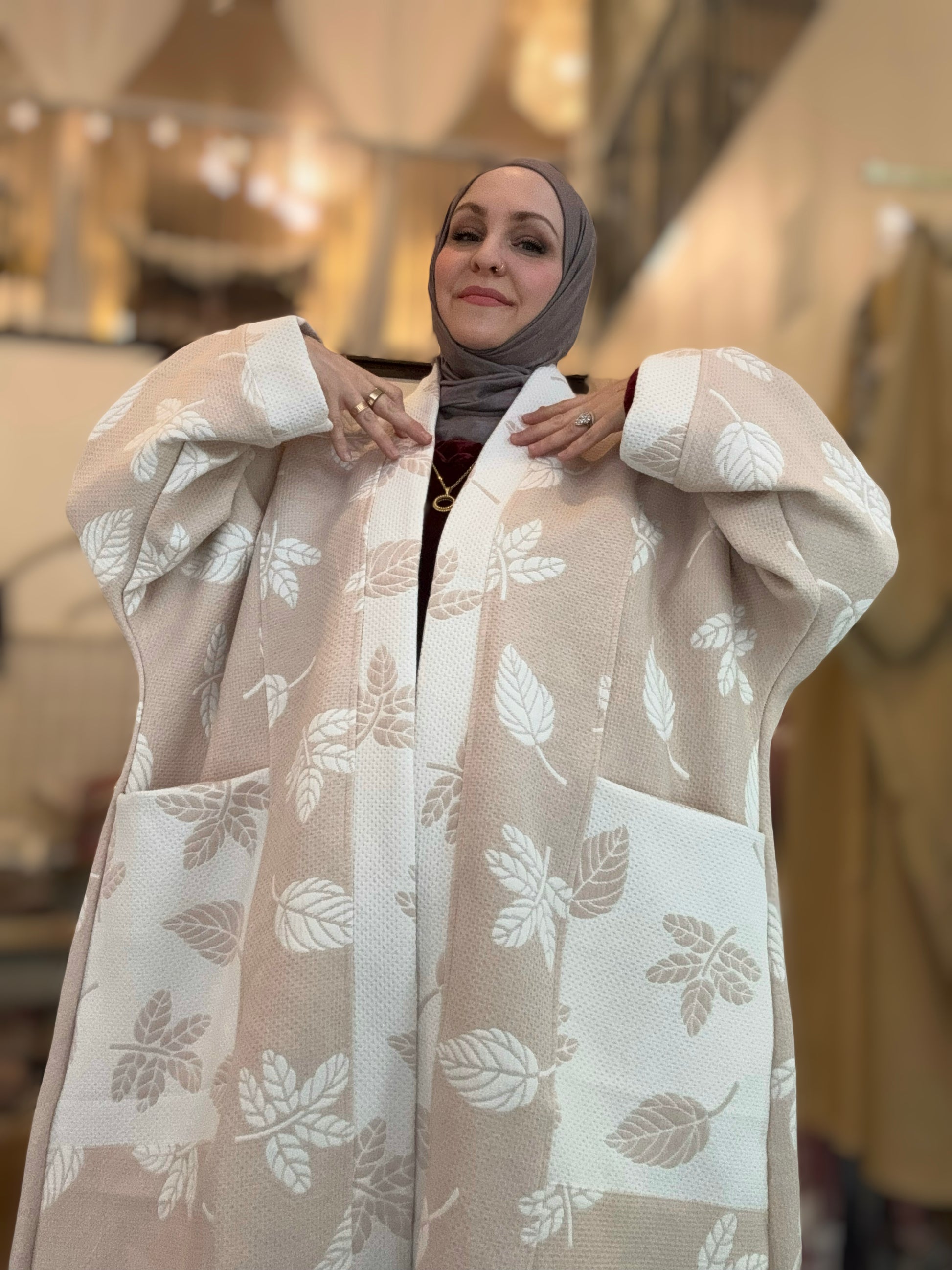 Each Sandstone Leaf Anorak Abaya is one-of-a-kind — sustainably made, luxuriously soft, and designed to honor modesty with effortless style. Its lightweight quilted feel provides warmth without bulk, making it incredibly versatile.