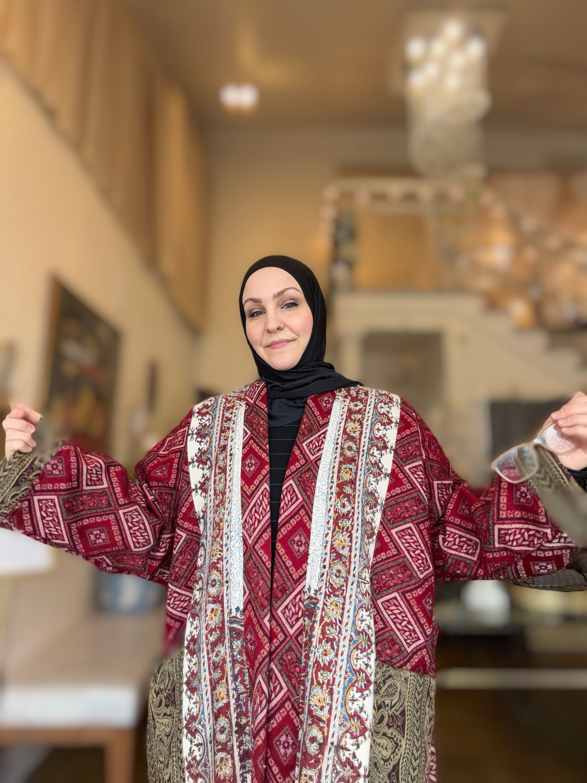 This piece carries the depth of cultural textile traditions while offering modern versatility and ease. The layered patterns and ornamental borders create striking visual interest without feeling overpowering, making it an effortless statement layer.
